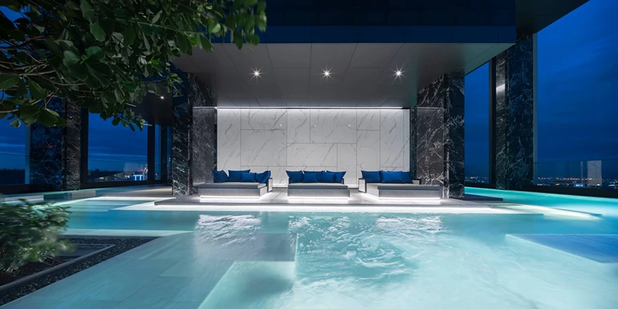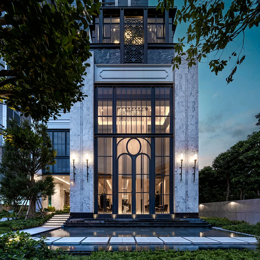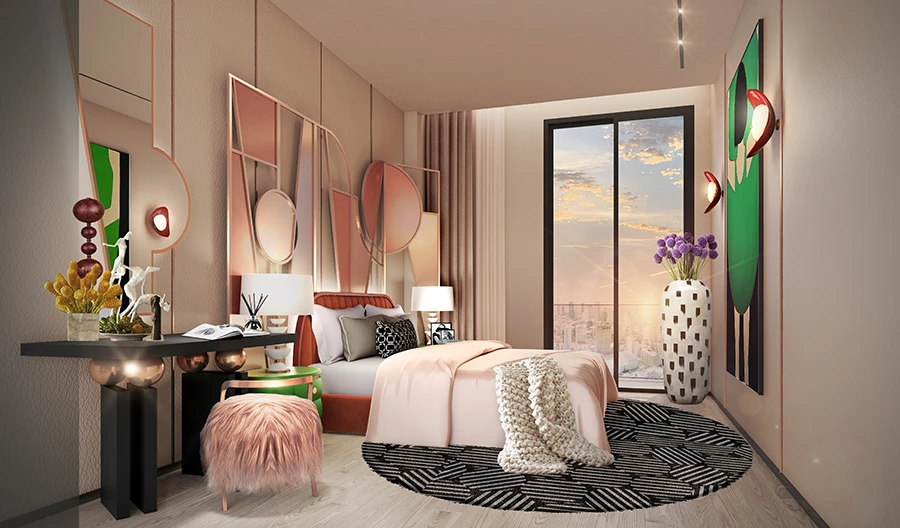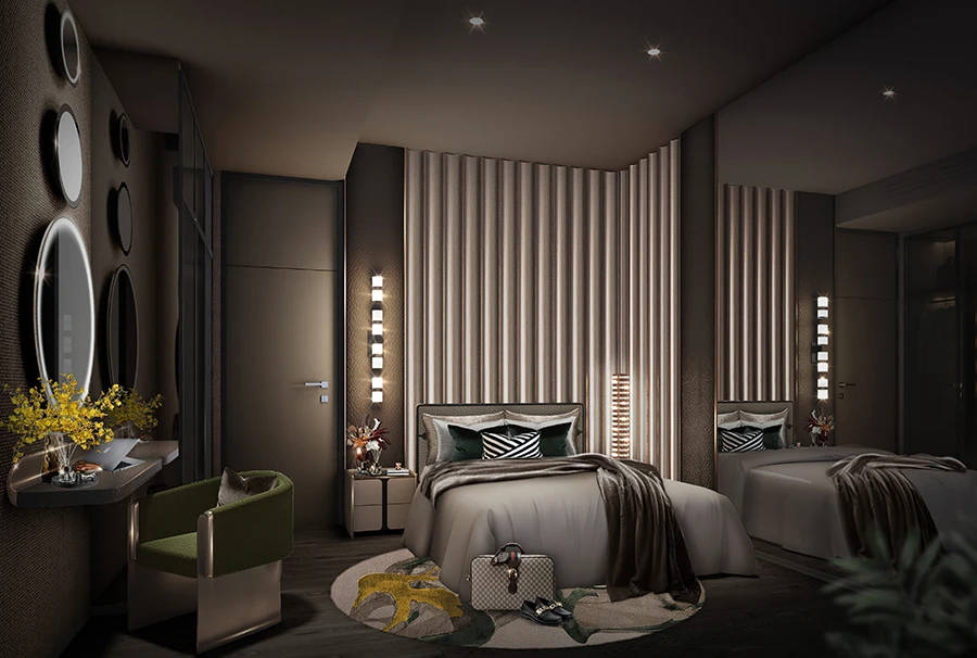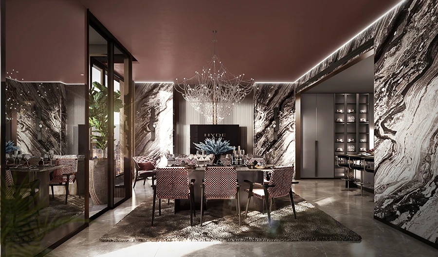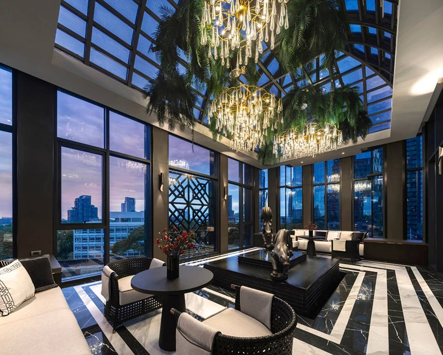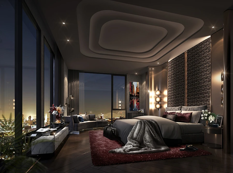 ด้วยการออกแบบเพื่อสร้างภาพจำที่ชัดเจนของห้องนี้ตั้งแต่ก้าวแรกที่เปิดประตูเข้ามา ให้อบอวลไปด้วยกลิ่นของไวน์แดงที่โอบล้อมด้วยวัสดุหรูหราชั้นยอด ไม่ว่าจะเป็นผนังหินอ่อน Venice Gray จากอิตาลี และเฟอร์นิเจอร์ระดับโลก ที่ขึ้นชื่อในเรื่องของความสบาย และ Classy อย่าง BAXTER ในบรรยากาศที่เรียบหรูเหมือน 6-Star Exclusive Lounge ที่ต่อเนื่องตั้งแต่ Living Room ไปจนถึงห้องนอนต่างๆ โดยเน้นให้ออกมาในโทนหรูหรา เคร่งขรึม Masculine แต่เพิ่มความสนุกด้วยการ Surprise ในห้องนอนที่ 3 ที่ Twist อารมณ์และความรู้สึกจากห้องทั้งหมด ด้วยการเป็นห้องนอนผู้หญิงสุด Feminine ในโทนสี Rose’ ทั้งห้อง ซึ่งเป็นสีที่ลดทอนความเข้มข้นมาจาก Burgundy Wine เบาบางและสนุกสนานด้วยสีสันของแฟชั่น