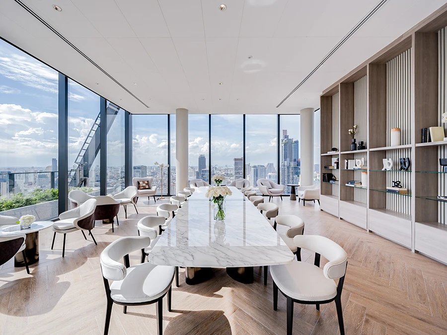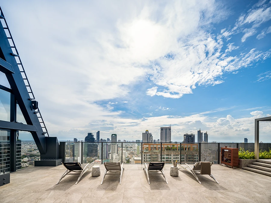 o เลาจน์สำหรับนั่งพักผ่อน และชมวิวเมือง ที่เปิดรับทิวทัศน์ของกรุงเทพฯ ได้อย่างตระการตา