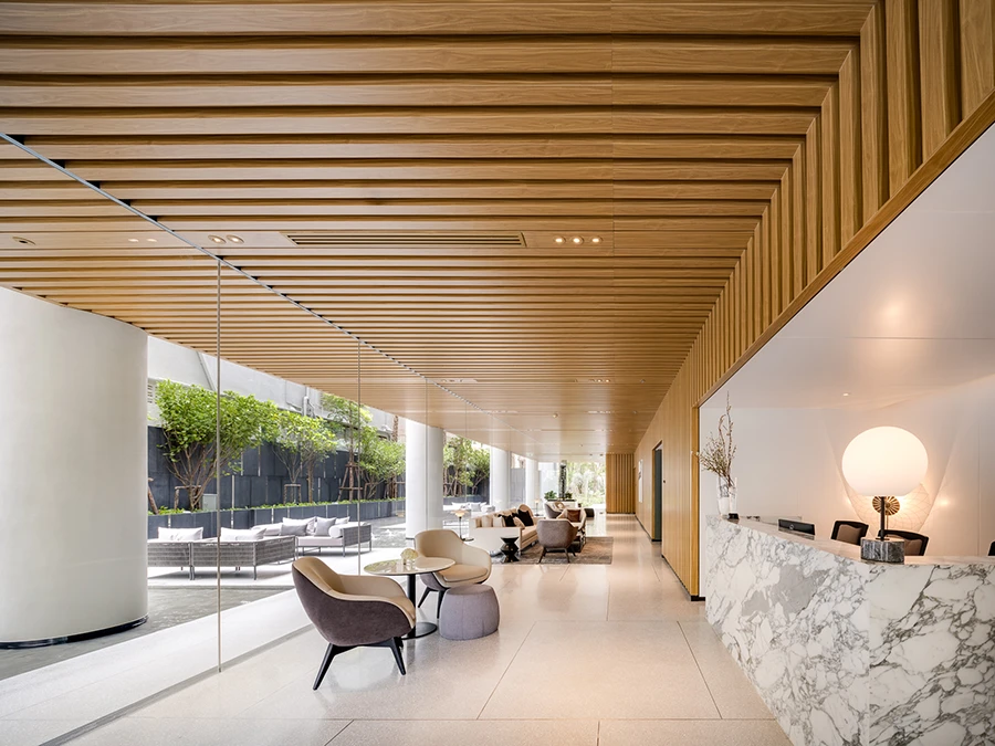 o ด้านหน้าโครงการ บริเวณล็อบบี้ โครงการมี Outdoor Lobby ซึ่งเชื่อมต่อกับสวนด้านหน้าของโครงการ ให้ความรู้สึกเสมือนพักในโรงแรม