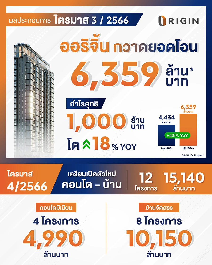 ออริจิ้น พร็อพเพอร์ตี้ กางผลประกอบการ Q3/2566 กวาดยอดกิจกรรมการโอนกรรมสิทธิ์ที่อยู่อาศัยทั้งโครงการ JV และ Non-JV กว่า 6,300 ล้าน โต 43% จากปีก่อนหน้า พร้อมคว้ากำไรสุทธิ 1,000 ล้าน เติบโต 18% เมื่อเทียบกับปีก่อนหน้า ชูหลากปัจจัยความสำเร็จโตยั่งยืน อาทิ การวางรากฐานพอร์ตกระจายความเสี่ยง-การรับรู้รายได้ต่อเนื่องจากโครงการขนาดใหญ่แบรนด์พาร์ค ออริจิ้น-การร่วมทุนพันธมิตรต่อเนื่อง ไตรมาส 4/2566 เตรียมเปิดตัวบ้าน-คอนโดใหม่เพิ่ม 12 โครงการ 15,140 ล้าน มั่นใจพร้อมส่งมอบสินค้า-บริการคุณภาพตอบโจทย์ Life Convenience