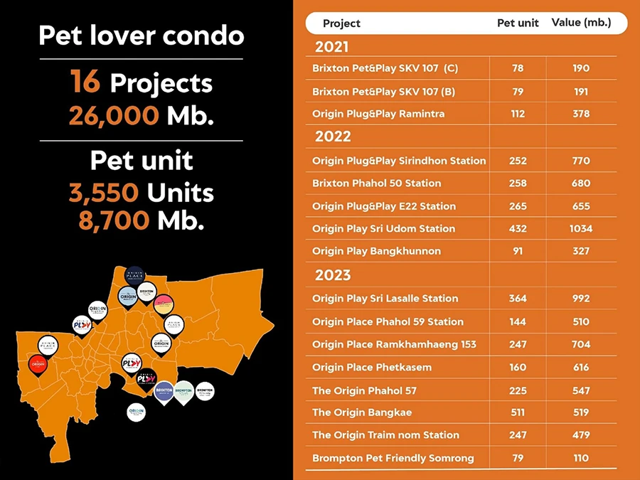นายอภิสิทธิ์ สุนทรชูเกียรติ ประธานเจ้าหน้าที่บริหาร บริษัท ออริจิ้น คอนโดมิเนียม จำกัด ผู้พัฒนาโครงการกลุ่มสมาร์ทคอนโดมิเนียมในเครือ บริษัท ออริจิ้น พร็อพเพอร์ตี้ จำกัด (มหาชน) หรือ ORI เปิดเผยว่า นับตั้งแต่ปี 2564 บริษัทได้เดินหน้าบุกตลาดคอนโดมิเนียมสำหรับกลุ่ม Pet Lover อย่างต่อเนื่อง เพื่อตอบโจทย์กลุ่มคนรุ่นใหม่ โดยเฉพาะกลุ่ม Gen Y และ Gen Z ที่นิยมเลี้ยงสัตว์ในที่อยู่อาศัยมากขึ้น โดย ณ สิ้นปี 2566 จะมีโครงการภายใต้แผนพัฒนาสะสมทั้งสิ้น 16 โครงการ คิดเป็นมูลค่าโครงการรวมประมาณ 26,000 ล้านบาท ครอบคลุมหลากหลายแบรนด์ อาทิ บรอมพ์ตัน (Brompton) บริกซ์ตัน (Brixton) ดิ ออริจิ้น (The Origin) ออริจิ้น เพลย์ (Origin Play) ออริจิ้น ปลั๊ก แอนด์ เพลย์ (Origin Plug & Play) ออริจิ้น เพลส (Origin Place) ส่งผลให้ปัจจุบัน บริษัทก้าวขึ้นมาเป็นผู้พัฒนาคอนโดเลี้ยงสัตว์ได้สะสมในตลาดมากที่สุดอันดับ 1