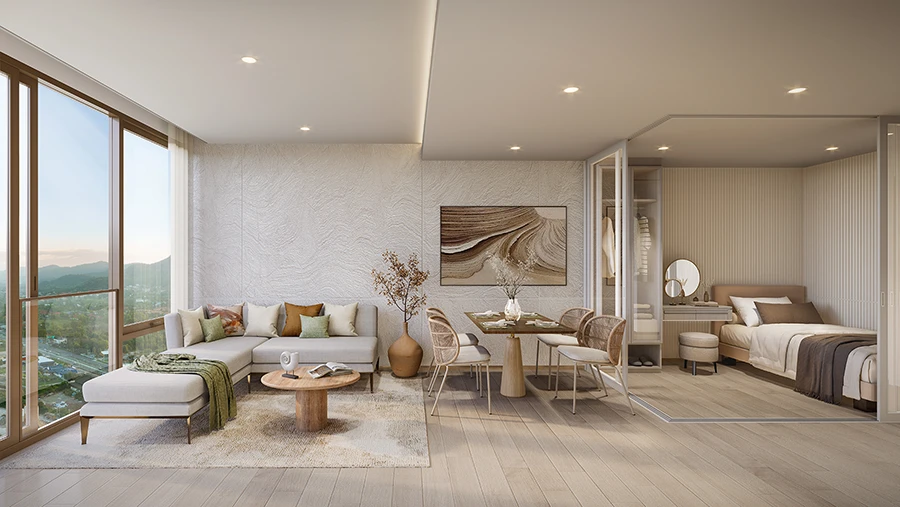 2) One Bed Extra Bliss 2 ขนาด ได้แก่ 59 ตร.ม. และ 61 ตร.ม ราคาเริ่มต้นที่ 7.85 ล้านบาท พิเศษตรงที่ได้พื้นที่ระเบียงใหญ่รับวิวทะเลและเขาตะเกียบแบบเต็มอิ่ม 1 ห้องนอน พร้อมห้องเอนกประสงค์ที่ลูกบ้านสามารถปรับใช้ได้ตามความต้องการ