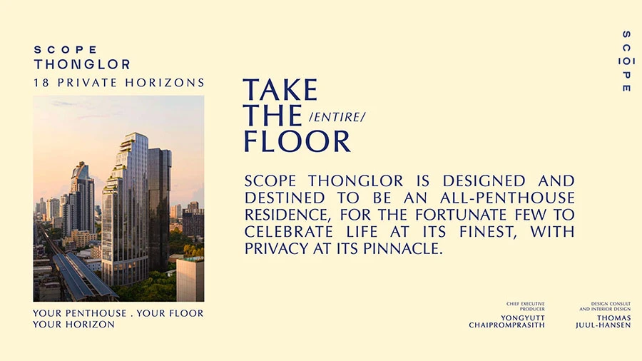 “และในวันนี้ สโคปภูมิใจนำเสนอโครงการใหม่ล่าสุด SCOPE THONGLOR (สโคป ทองหล่อ) ปรากฏการณ์ครั้งยิ่งใหญ่แห่งวงการอสังหาฯ ไทย กับโครงการที่อยู่อาศัยแนวสูงบนถนนสุขุมวิท ติดบีทีเอสทองหล่อ มูลค่ากว่า 3,000 ล้านบาท คอนโดฯ High – Rise 32 ชั้น 18 ยูนิต ที่จะมาในรูปแบบเพนต์เฮาส์ 100% มาพร้อมความพิเศษของการออกแบบสถาปัตยกรรมและการตกแต่งภายในที่ยกระดับมาตรฐานของที่อยู่อาศัยในประเทศไทยให้เทียบเท่าระดับอินเตอร์เนชั่นแนลโดยดีไซน์เนอร์ระดับโลกอย่าง Thomas Juul-Hansen ผู้เปลี่ยนโลกดีไซน์ด้วยการออกแบบเชิงคุณภาพ และความใส่ใจในรายละเอียด โดยยูนิตเริ่มต้นของโครงการมาในรูปแบบเพนต์เฮาส์ทั้งชั้นขนาด 4 ห้องนอน 4 ห้องน้ำ 1 ห้องพาวเดอร์ และ 2 ลิฟต์ส่วนตัว ที่มีพื้นที่ใช้สอยประมาณ 415 ตร.ม. ซึ่งมีกำหนดราคาเริ่มต้นที่ 200 ล้านบาท โดยโครงการ SCOPE THONGLOR พัฒนาขึ้นเพื่อตอบโจทย์ความต้องการและรสนิยมลูกค้ากลุ่มคนรุ่นใหม่ผู้มีความมั่งคั่งสูงหรือ Young High Net Worth Individuals ที่ต้องการครอบครองที่อยู่อาศัยใจกลางเมือง ไม่ใช่แค่เรื่องคุณภาพของโครงการที่คัดสรรวัสดุที่ได้มาตรฐานระดับสากล และการออกแบบระดับโลกเท่านั้น แต่ยังมอบประสบการณ์การอยู่อาศัยที่แตกต่างด้วย Space กว้างขวาง ไม่ต่างจากการอยู่อาศัยในบ้านเดี่ยว ให้คุณได้เต็มที่กับทุกตารางนิ้วในที่พักอาศัย สามารถเป็นเจ้าของวิว 360 องศาของทองหล่อได้ในทุกๆ ยูนิต รวมถึงไลฟ์สไตล์ที่สะดวกสบายจากทำเลที่ตั้งบนถนนสุขุมวิท ห่างจากบีทีเอสทองหล่อเพียง 0 เมตรประหยัดเวลาในการเข้าถึงสถานที่รอบข้าง รายล้อมด้วยไลฟ์สไตล์เดสทิเนชั่นครบครันทั้งกลางวันและกลางคืน รวมถึงบริการ Concierge service ช่วยเหลือและอำนวยความสะดวกแก่ลูกบ้านตลอด 24 ชั่วโมง และ Facilities ที่ครบครัน คิดมาให้ครอบคลุมการใช้ชีวิตในทุกมิติเหนือกว่าที่คุณจะจินตนาการ ที่สำคัญยังมอบความเป็นส่วนตัวสูงสุดในทุกยูนิตกับ Private Lift ที่มีมาให้ถึง 2 ตัวในทุกยูนิต ทำให้โอกาสจะพบเจอเพื่อนบ้านเป็นแบบ Meet by choice, not by chance”