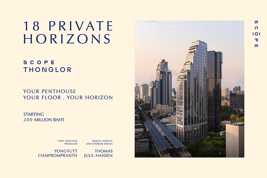 ซึ่งจากพฤติกรรมของผู้ซื้อระดับอัลตร้าลักซ์ชัวรีดังกล่าวทำให้ สโคป มุ่งมั่นสร้างสรรค์นวัตกรรมใหม่ของวงการการพัฒนาที่อยู่อาศัยเพื่อมอบประสบการณ์เหนือระดับให้กับลูกบ้านในแบบที่ไม่เคยเกิดขึ้นมาก่อนในประเทศไทย กับโครงการ สโคป ทองหล่อ ที่ทุกยูนิตถูกสร้างสรรค์ขึ้นในรูปแบบ เพนท์เฮ้าส์ 100% (All-Penthouse Residence) เต็มพื้นที่ 1 ชั้นต่อ 1 ยูนิต มอบความลักซ์ชัวรีที่มาในรูปแบบของพื้นที่ใช้สอยที่ตอบโจทย์การอยู่อาศัยได้ไม่ต่างจากการอยู่อาศัยในโครงการแนวราบ แต่เหนือกว่าด้วยทำเลใจกลางเมือง ในแบบที่ไม่เคยมีที่อยู่อาศัยโครงการใดทำได้มาก่อน ด้วยพื้นที่ใช้สอยเริ่มต้นสูงถึง 415 ตารางเมตร มาพร้อมฟังก์ชั่นเริ่มต้นที่ 4 ห้องนอน 4 ห้องน้ำ และ 1 ห้องพาวเดอร์ ในราคาเริ่มต้น 200 ล้านบาท ซึ่งสิทธิประโยชน์ที่ตามมาจากพื้นที่ใช้สอย คือความเป็นส่วนตัวอย่างสูงสุด มอบโอกาสในการพบเจอเพื่อนบ้านที่น้อยมากๆ แบบ Meet by choice, not by chance เนื่องจากไม่ต้องใช้โครงสร้างอาคารในชั้นเดียวกันร่วมกับเพื่อนบ้าน ไม่มีพื้นที่กับยูนิตอื่นๆ ในแนวราบ นอกจากความสบายในเรื่องพื้นที่ใช้สอยที่เหนือกว่าความต้องการ ยังสามารถสร้างความสบายใจในการอยู่อาศัย ได้มากกว่าการอยู่อาศัยในคอนโดมิเนียมทั่วไป เพราะทุกยูนิตมีพื้นที่อยู่อาศัยที่ใกล้เคียงกัน หมดปัญหาไลฟ์สไตล์และความต้องการที่แตกต่าง เพราะการอยู่อาศัยในขนาดพื้นที่ที่ต่างกัน ก็ย่อมมีความต้องการและไลฟ์สไตล์ที่ต่างกันไปด้วย ทำให้การใช้ชีวิตร่วมกันในโครงการเป็นไปอย่างราบรื่น ไร้การกระทบกระทั่ง หรือปัญหาจุกจิกเล็กๆ น้อยๆ กวนใจ นอกจากนี้ด้วยแนวคิดของโครงการยังให้ความสำคัญในเรื่องของการกำหนดจำนวนพนักงานในโครงการให้มีจำนวนใกล้เคียงกับจำนวนผู้พักอาศัย เพื่อให้มั่นใจได้ว่าผู้อาศัยทุกท่านจะได้รับบริการจากมืออาชีพอย่างทั่วถึง ครอบคลุม ครบทุกมิติ