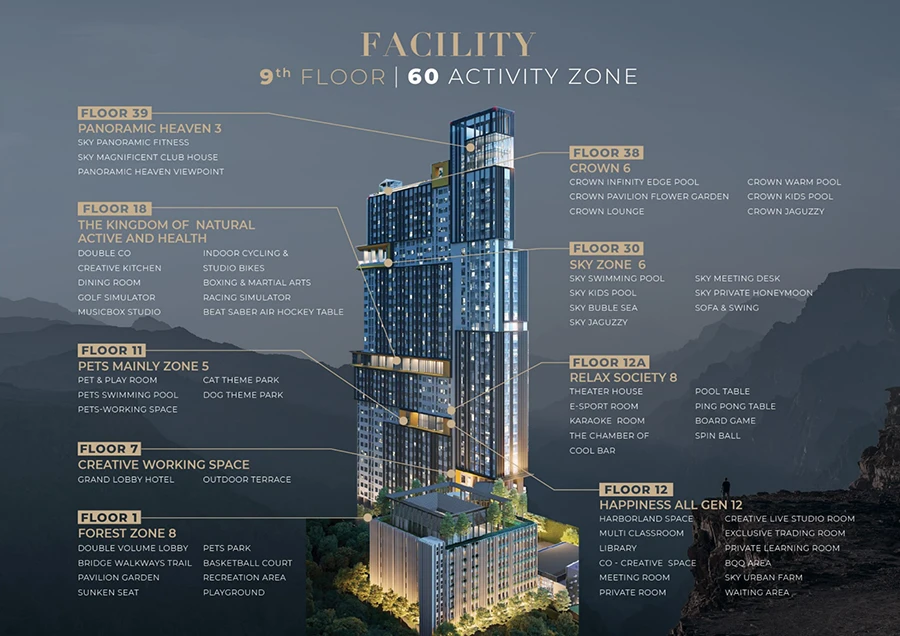 - ชั้นบนสุด ชั้น 39 Club House Aurora Borealis คลับเฮ้าส์ที่ออกแบบตกแต่งด้วยแชนเดอเลียร์ (Chandelier) เปรียบเสมือนแสงเหนือ สามารถเปลี่ยนสีได้ และมี Luxury Zone ที่สามารถจองเพื่อจัดปาร์ตี้ งานแต่งงาน ทั้งกลางวันและกลางคืนได้