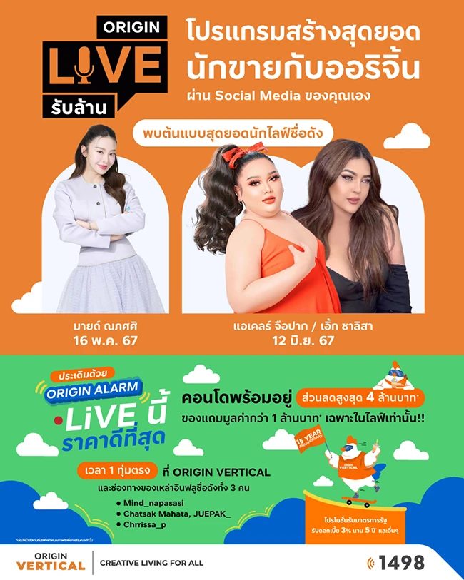 นายกฤษณ์ กล่าวอีกว่า เพื่อสร้างแรงบันดาลใจให้แก่เหล่าครีเอเตอร์ บริษัทเตรียมจัดแคมเปญ ORIGIN LIVE รับล้าน ร่วมกับ 3 ครีเอเตอร์ตัวท็อป ได้แก่ มายด์ ณภศศิ, เอแคลร์ จือปาก, เอิ้ก ชาลิสา ซึ่งเป็นนักขายที่มาแรงที่สุดแห่งปี มาร่วม Live พร้อมจัดโปรโมชั่นพิเศษกับคอนโดมิเนียมทั้งโครงการใหม่และพร้อมอยู่รวม 15 โครงการ จากทั้งในกรุงเทพฯ-ปริมณฑล และเขตพัฒนาพิเศษภาคตะวันออก (EEC) มอบส่วนลดสูงสุดภายใน Live ถึง 4 ล้านบาท โดยจะ Live ในวันที่ 16 พ.ค. 67 และ 12 มิ.ย. 67 เวลา 19.00 น. ทาง Facebook และ Tiktok ของ ORIGIN VERTICAL และช่องทางของสุดยอดนักขาย