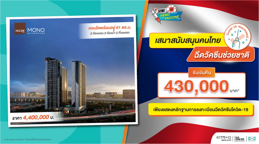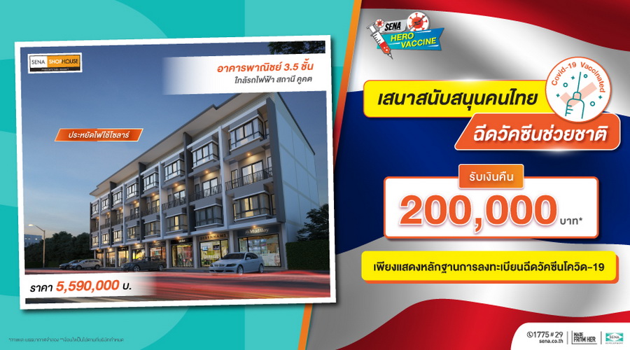 SENA เล็งเห็นถึงความปลอดภัยของลูกค้าเป็นสิ่งสำคัญสุด เดินหน้าตั้งการ์ดสูง ปรับแผนกู้วิกฤตสู้โควิด - 19 ขานรับพร้อมให้ความร่วมมือภาครัฐ และรับผิดชอบต่อสังคม ลดการแพร่ระบาดของเชื้อไวรัสโควิด - 19 ชูเซอร์วิสเซฟลูกค้า บริการขายออนไลน์ผ่าน 4 ช่องทาง ล่าสุดเปิดลิสต์บ้านเดี่ยว - คอนโด 22 โครงการ อัดโปรฯ "SENA HERO VACCINE" สนับสนุนคนไทยฉีดวัคซีนช่วยชาติ รับส่วนลดสูงสุดถึง 500,000 บาท เริ่มแล้วตั้งแต่วันนี้ จนถึง 15 ก.ย.64