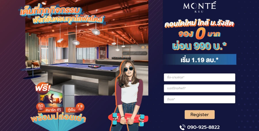 มอนเต้ รังสิต (Monte RSU) คอนโดใหม่ใกล้ ม.รังสิต เมืองทองธานี และสนามบินดอนเมือง ตอบโจทย์ทุก Lifestyle ที่แตกต่าง แต่ลงตัว โดดเด่นด้วยดีไซน์ล้ำสมัย ภายใต้ Content Iconic Freeform สะดวกสบายด้วย Smart Facilities และ Smart Design ด้วย Function ที่มีให้เลือกได้อย่างอิสระในแบบ Fully Furnished ใกล้ ม.รังสิตเพียง 1.5 กิโลเมตร สะดวกเดินทางเพียง 5 นาที ส่วนกลางสุดอลังการ ตอบโจทย์ทุกกิจกรรมของคนรุ่นใหม่ ใกล้แหล่งอำนวยความสะดวก ร้านอาหาร ร้านสะดวกซื้อ และรถไฟฟ้าสายสีแดง สถานีรังสิต