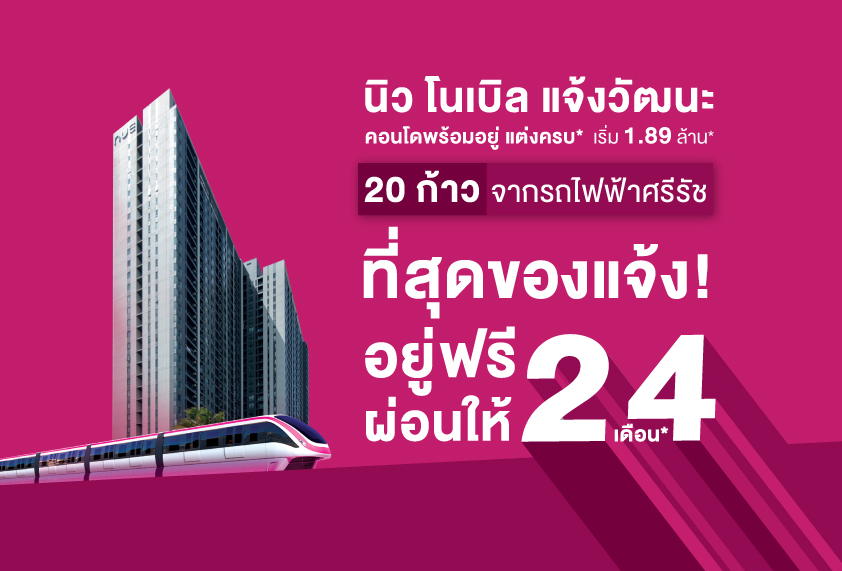 นิว โนเบิล แจ้งวัฒนะ (NUE Noble Chaengwattana) โครงการน้องใหม่ภายใต้แบรนด์ใหม่จากโนเบิล คอนโดมิเนียมแนวสูงแต่งครบพร้อมเฟอร์นิเจอร์ ติดถนนแจ้งวัฒนะ ที่มาภายใต้คอนเซปต์ "จัดจ้านในย่านแจ้ง" กับโทนสีชมพู Chocky Pink สุดจี๊ด และดีไซน์โดดเด่นที่แตกต่างเฉพาะตัวตามสไตล์คนเมือง โดดเด่นด้วยทำเลเพียง 20 ก้าวถึงรถไฟฟ้า MRT สายสีชมพู (ในอนาคต) สถานีศรีรัช ใกล้ทางด่วนศรีรัชเพียง 500 เมตร จัดเต็มด้วยสิ่งอำนวยความสะดวกในโครงการ พร้อมดีไซน์สไตล์ Modern ที่ยังคงความเป็นเอกลักษณ์เฉพาะตัวตามแบบฉนับ Noble ในราคาที่สามารถเข้าถึงได้ง่ายและจับจองเป็นเจ้าของได้ไม่ยากนัก อ่านรีวิวฉบับเต็มเพิ่มได้ที่นี่ โปรชันล่าสุด โปรโมชันล่าสุด 1 ห้องนอน 28.4 ตร.ม. Fully Furnished ราคาเริ่มต้น 1.89 ล้านบาทอยู่ฟรี ผ่อนให้ 24 เดือน*