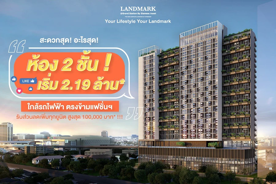 แลนด์มาร์ค แอท แกรนด์ สเตชั่น (LANDMARK @Grand Station) คอนโด High Rise ใกล้รถไฟฟ้าสายสีชมพู Branded Residence มาเหนือ กับบริการมาตรฐานโรงแรมระดับสากล เป็นมากกว่าคอนโดกับ Hotel Service ที่พร้อมบริการ 24 ชั่วโมง ครอบคลุมสุด มีห้องหลายแบบรองรับคนทุกGen ทุกไลฟ์สไตล์ เตรียมเปิดจองพร้อมกัน 28 ส.ค.นี้ คุ้มค่าสุด จองปีนี้จ่ายปีหน้า ราคาเริ่มต้น 2.19 ล้านบาท*
