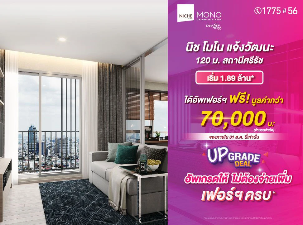นิช โมโน แจ้งวัฒนะ (Niche Mono Chaengwattana) คอนโดใหม่รูปแบบโมเดิร์นไลฟ์สไตล์ที่ตอบโจทย์ชีวิตคุณและครอบครัว ตั้งอยู่ระหว่างซอย แจ้งวัฒนะ 41 กับ 43 ใกล้รถไฟฟ้าสายสีชมพู MRT สถานีศรีรัช แค่ 120 ม. ใกล้ศูนย์ราชการแจ้งวัฒนะ, อิมแพค เมืองทอง, เซ็นทรัลแจ้งวัฒนะ และ แม็คโคร แจ้งวัฒนะ ห้องของโครงการนี้แต่งครบแบบ Fully Furnished ราคาเริ่มต้น 1.89 ล้าน โปรโมชันได้เฟอร์ฟรีมูลค่ากว่า 70,000 บาท จองภายใน 31 สิงหาคมนี้