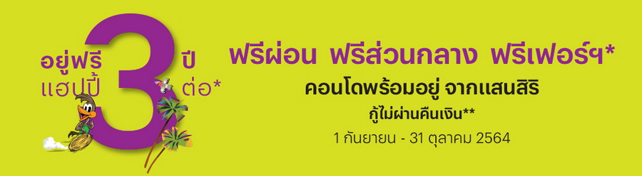 โปรโมชั่น :โปรอยู่ฟรี 3 ปี แฮปปี้ 3 ต่อ ตั้งแต่ 1 กันยายน - 31 ตุลาคม 2564