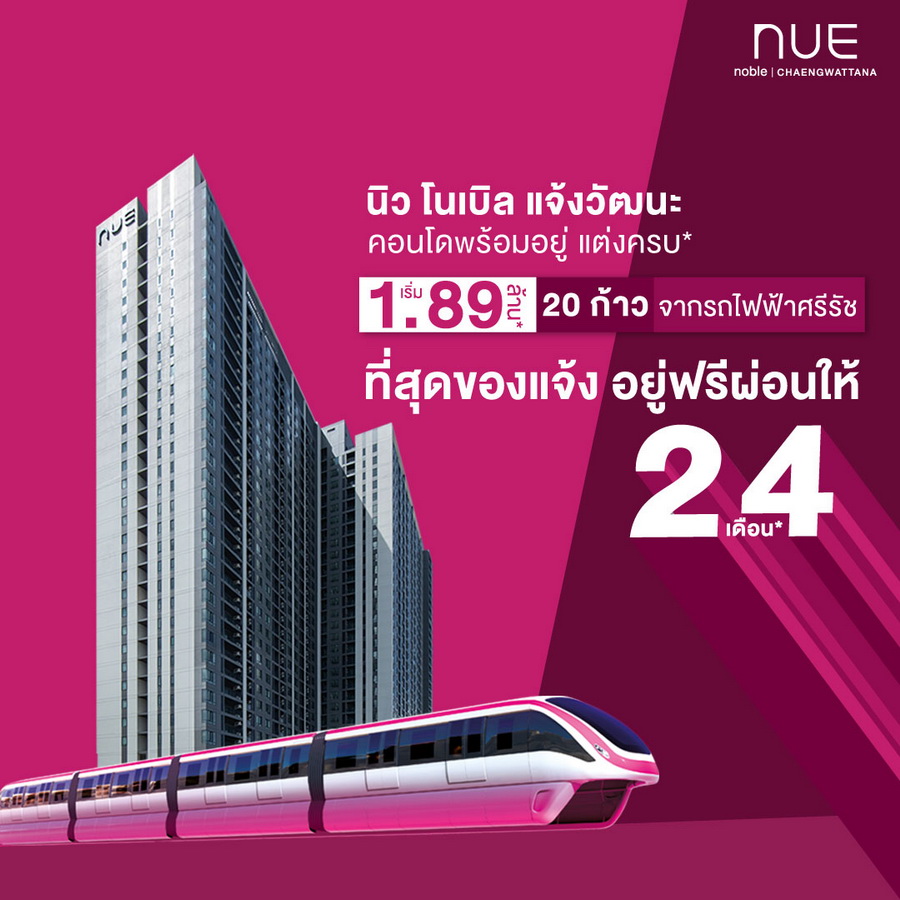 นิว โนเบิล แจ้งวัฒนะ (NUE Noble Chaengwattana) คอนโดพร้อมอยู่แต่งครบ กับดีไซน์ที่จัดจ้านโดดเด่น เพียง 20 ก้าว จากรถไฟฟ้าศรีรัช สายสีชมพู ติดแม็คโครแจ้งวัฒนะ ใกล้อิมแพ็คเมืองทองธานี ใกล้ห้างเซ็นทรัลแจ้งวัฒนะ ใกล้ศูนย์ราชการ มหาวิทยาลัย และทางด่วน มาพร้อมส่วนกลางสไตล์โมเดิร์น สระว่ายยาว 30 เมตร พร้อมอ่างจากุซซี่ ฟิตเนสพร้อมวิวแบบพาโนราม่า ห้องอ่านหนังสือ ห้องนั่งเล่น พื้นที่สีเขียวสุดร่มรื่น