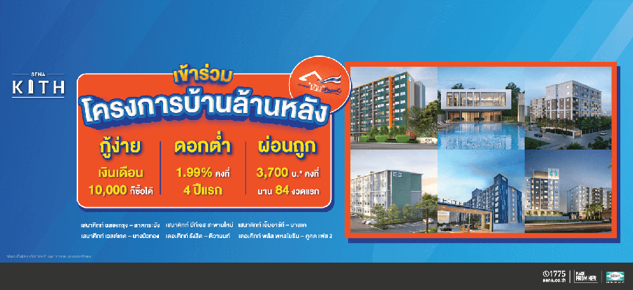 เสนา จัดโปร คอนโดเสนาคิทท์ ร่วมโครงการบ้านล้านหลัง เฟส 2 กู้ง่าย เงินเดือน 10,000 บาทก็ซื้อได้ ดอกต่ำ เพียง 1.99% คงที่ 4 ปีแรก ผ่อนถูก เริ่ม 3,700 บ.* คงที่ นานสูงสุด 40 ปี ราคาไม่เกิน 1.2 ล้าน เลือกโครงการคุณภาพจากเสนาในทำเลที่ใช่สำหรับคุณ