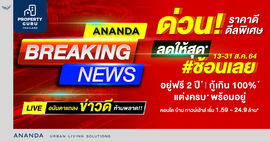 อนันดา ดีเวลลอปเม้นท์ เดินหน้ากระตุ้นตลาดอสังหาริมทรัพย์ช่วงครึ่งปีหลังส่งแคมเปญ "Ananda Breaking News" ด่วน!! ราคาดี ดีลพิเศษ ลดให้สุด เพิ่มโอกาสให้ลูกค้ามีที่อยู่อาศัยได้ง่ายขึ้น ทั้งคอนโดมิเนียม บ้านเดี่ยว และทาวน์เฮ้าส์ โครงการคุณภาพเยี่ยมบนทำเลศักยภาพที่ดีที่สุดของกรุงเทพฯกว่า 33 โครงการ อาทิ แอชตัน, ไอดีโอ คิว, ไอดีโอ โมบิ, ไอดีโอ, เอลลิโอ, ยูนิโอ, อาร์เทล, แอริ, เอโทล, เออร์บานิโอ และ ยูนิโอทาวน์ ภายใต้แบรนด์คุณภาพ พร้อมจัดโปรโมชั่น "อยู่ฟรี 2 ปี* กู้เกิน 100%* แต่งครบ* พร้อมอยู่" เริ่ม 1.59 - 24.9 ล้านบาท* ขยายเวลาถึง 30 กันยายนนี้