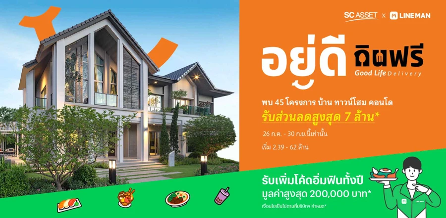 SC x LINE MAN ปล่อยแคมเปญพิเศษภายใต้คุณภาพชีวิตดีๆ "อยู่ดี กินฟรี" (Good Life Delivery) สำหรับลูกค้าที่จองซื้อบ้าน 45 โครงการคุณภาพ บ้าน ทาวน์โฮม และ คอนโด ราคาเริ่ม 2.39-62 ล้านบาทตั้งแต่วันนี้ - 30 กันยายน 2564"