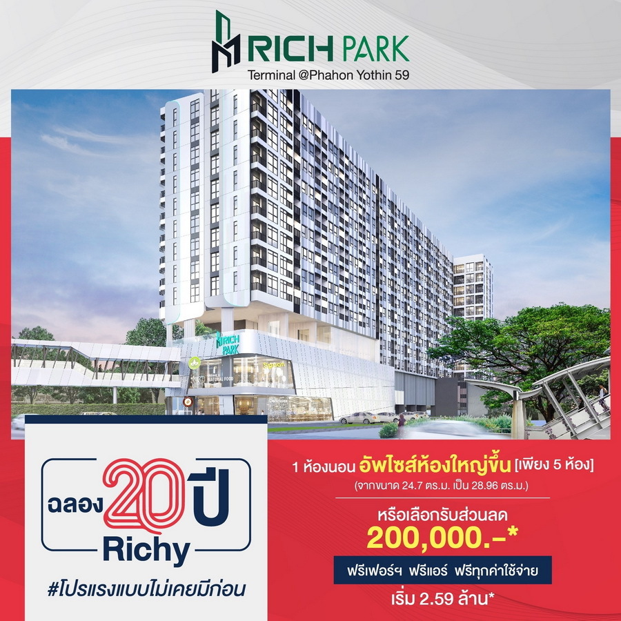 ริชพาร์ค เทอมินอล @พหลโยธิน59 (Rich Park Terminal @ Phahonyothin 59) สไตล์โมเดิร์น ติดรถไฟฟ้าสายสีเขียว สถานีพหลโยธิน 59 สะดวกด้วยขั้นสุดด้วยทางเชื่อมต่อ Sky walk เข้าสู่ตัวโครงการ ราคาเริ่มต้น 2.59 ล้านบาท