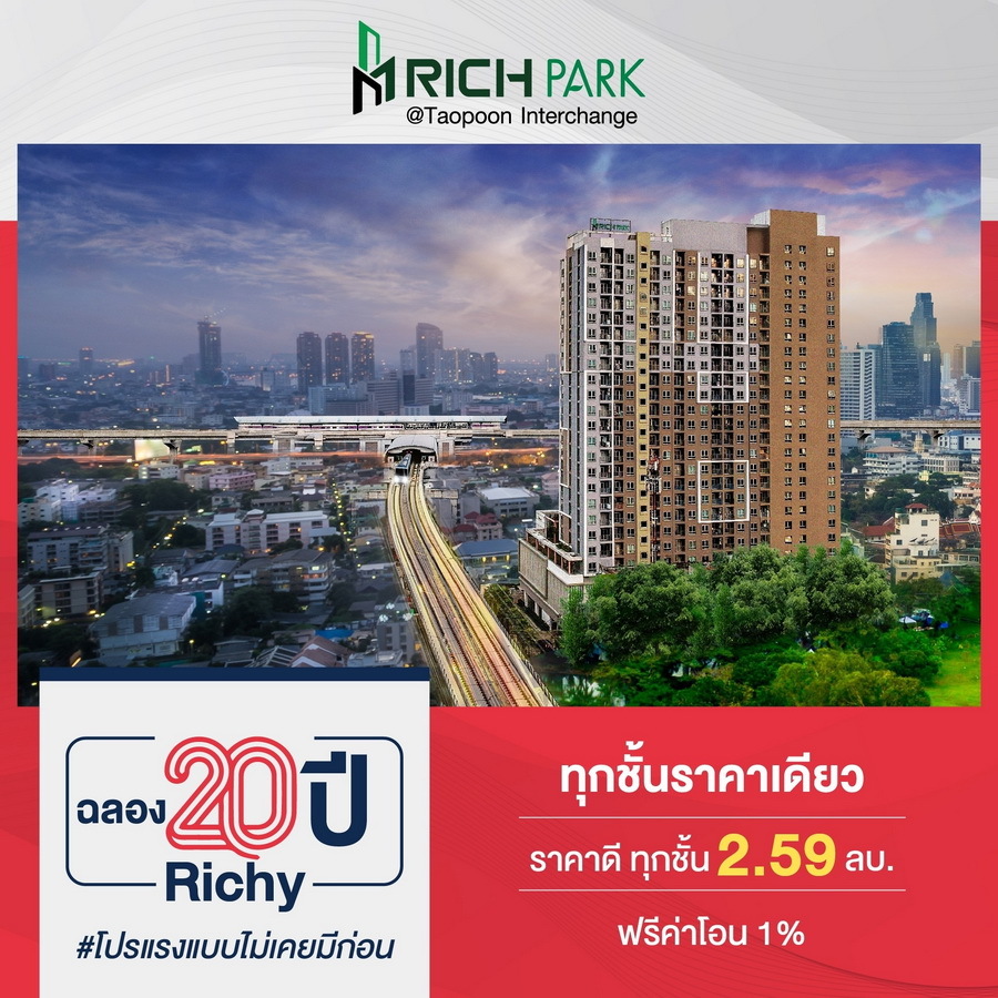เดอะริช พาร์ค เตาปูน-อินเตอร์เชนจ์ (The Rich Park Taopoon-Interchange) คอนโดห้องหน้ากว้าง เฟอร์ครบ พร้อมเข้าอยู่ ใกล้รถไฟฟ้า 2 สาย สายสีน้ำเงิน และสายสีม่วง ทุกชั้นราคาเดียว 2.59 ล้านบาท ฟรีค่าโอน 1%