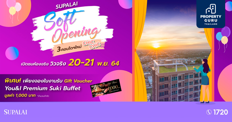 เตรียมเปิดให้ชมห้องจริง วิวจริง พร้มอพบกับโปรโมชั่นและสิทธิพิเศษมากมาย วันที่ 20 - 21 พฤศจิกายน 2564 ณ สำนักงานขายทั้ง 3 โครงการ จองภายในงาน รับฟรี!* Gift Voucher You&I Premium Suki Buffet มูลค่า 1,000 บาท* พิเศษ! SUPALAIxLAZADA ซื้อคูปอง 11 บาท รับส่วนลดเพิ่ม 20,000 บาท*