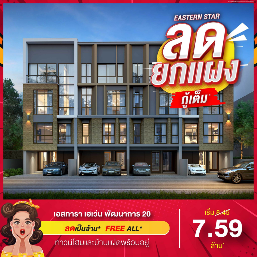 เอสทารา เฮเว่น พัฒนาการ 20 (Estara Haven Pattanakarn 20) บ้านพร้อมเข้าอยู่ ท่ามกลางสวนธรรมชาติขนาดใหญ่ ติดย่านธุรกิจ สุขุมวิท ทองหล่อ เอกมัย อโศก ใกล้จุดขึ้นลงทางด่วนสู่ สาทร สีลม และ รถไฟฟ้า 3 สาย บ้านแฝด 3 ชั้น เริ่ม 12.79 ล้าน* และทาวน์โฮม 3.5 ชั้น เริ่ม 7.59 ล้าน*