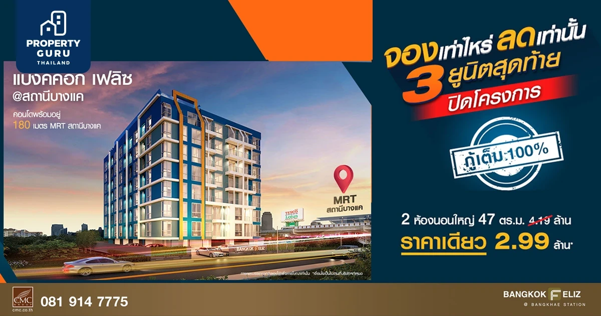 แบงค์คอก เฟ'ลิซ @ สถานีบางแค (Bangkok Feliz @ Bangkae Station) จาก CMC GROUP มอบสมดุลแห่งการใช้ชีวิต ไลฟ์สไตล์ที่เป็นคุณกับคอนโดแนวรถไฟฟ้า จัดโปรโมชั่น "จองเท่าไหร่ ลดเท่านั้น 3 ยูนิต สุดท้าย ปิดโครงการ" พิเศษ ห้องแบบ 2 ห้องนอนใหญ่ ขนาด 47 ตร.ม. ราคาเดียว 2.99 ล้าน*