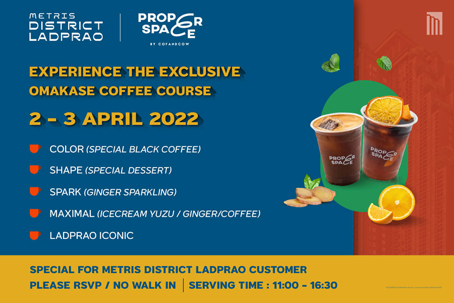 พิเศษสุด! สำหรับลูกค้าที่เยี่ยมชมโครงการในวันดังกล่าว จะได้สัมผัสกับประสบการณ์ใหม่ที่นี่ที่เดียว ด้วยคอร์สพิเศษ OMAKASE COFFEE ฟรี!! จากร้าน PROPER SPACE ตั้งแต่เวลา 11.00 -16.30 น. พบกับเมนูรังสรรค์พิเศษมาให้จิบกันอย่างจุใจ อาทิ Special Black Coffee, Special Dessert, Ginger Sparkling, Ice-cream Yuzu และเมนูซิกเนเจอร์อย่าง Ladprao Iconic คอร์สพิเศษมีจำนวนจำกัด 35 ที่นั่งต่อวัน