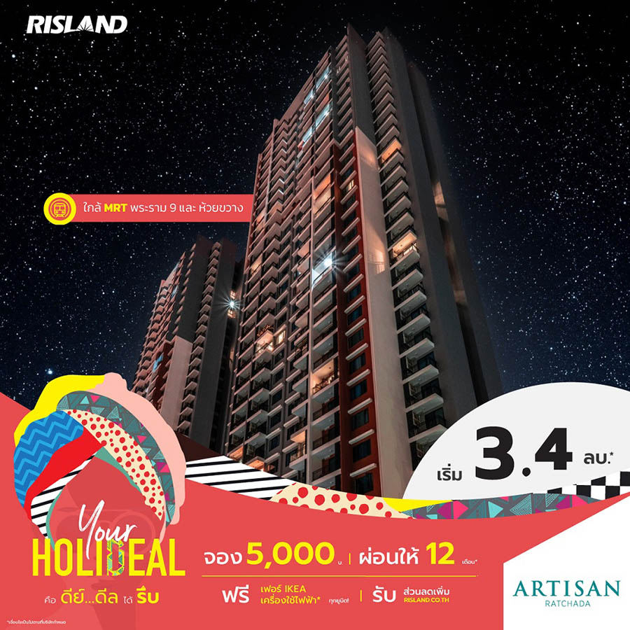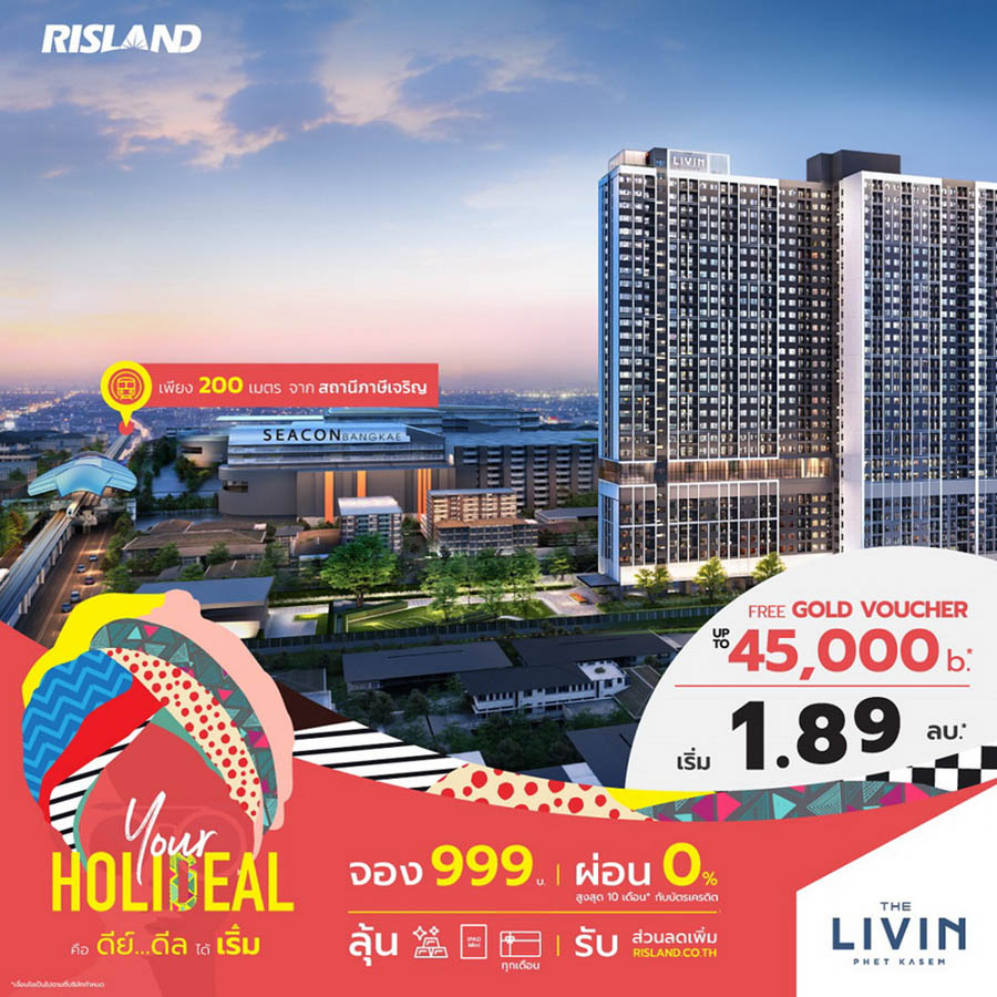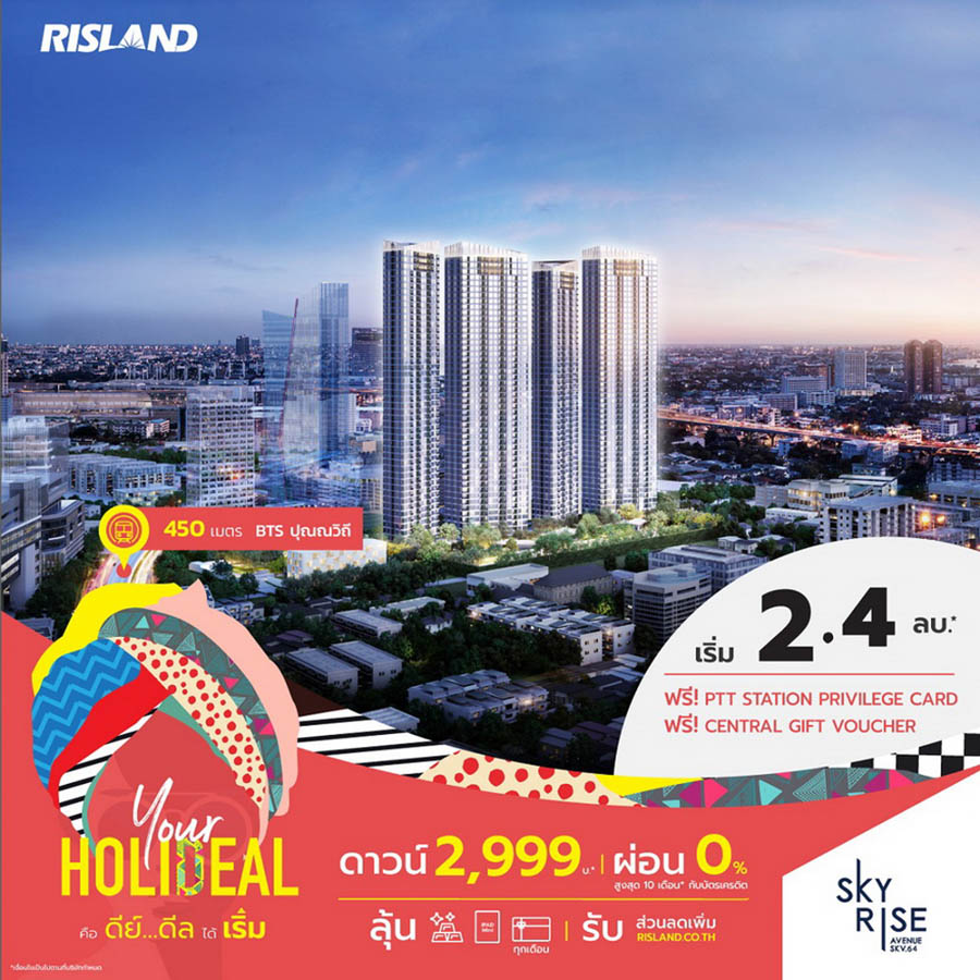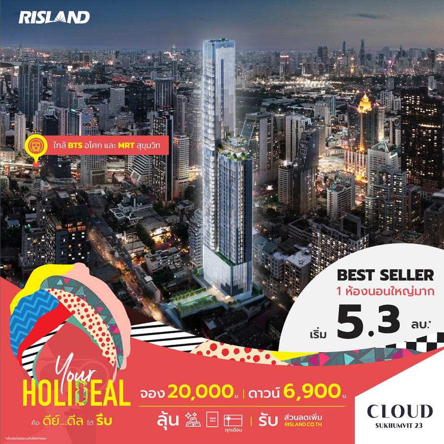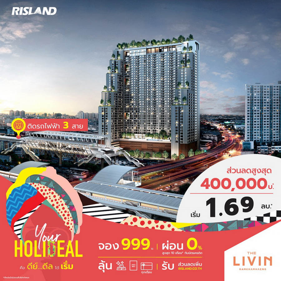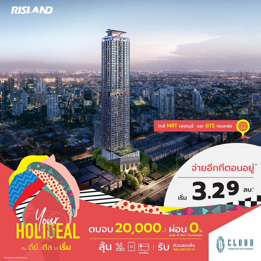 พร้อมส่งความสุขช่วงซัมเมอร์แบบเต็มที่ สำหรับ ริสแลนด์ (ประเทศไทย) ได้จัดแคมเปญ “Your Holideal” เสิร์ฟ 2 ดีลเด็ดโดนใจให้ลูกค้าได้เลือกช็อปตามความชอบ ไม่ว่าจะเป็น “สายเริ่ม” กับผู้ที่สนใจโครงการ Pre-sale ได้แก่ คลาวด์ ทองหล่อ-เพชรบุรี, คลาวด์ สุขุมวิท 23, เดอะ ลิฟวิน เพชรเกษม, เดอะ ลิฟวิน รามคำแหง และสกายไรส์ อเวนิว สุขุมวิท 64 โดยจองเบาๆ เริ่มต้นเพียง 999 บาท พร้อมผ่อน 0% สูงสุด 10 เดือนกับบัตรเครดิต และลุ้น Lucky Draw รับของรางวัลอีกมากมายทุกเดือน ทั้งบัตรกำนัลทองคำ, iPad Mini และ Central Gift Voucher 10,000 บาท