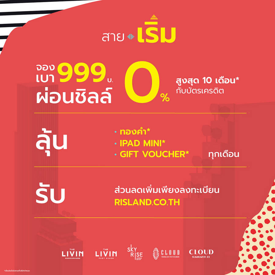 พร้อมส่งความสุขช่วงซัมเมอร์แบบเต็มที่ สำหรับ ริสแลนด์ (ประเทศไทย) ได้จัดแคมเปญ “Your Holideal” เสิร์ฟ 2 ดีลเด็ดโดนใจให้ลูกค้าได้เลือกช็อปตามความชอบ ไม่ว่าจะเป็น “สายเริ่ม” กับผู้ที่สนใจโครงการ Pre-sale ได้แก่ คลาวด์ ทองหล่อ-เพชรบุรี, คลาวด์ สุขุมวิท 23, เดอะ ลิฟวิน เพชรเกษม, เดอะ ลิฟวิน รามคำแหง และสกายไรส์ อเวนิว สุขุมวิท 64 โดยจองเบาๆ เริ่มต้นเพียง 999 บาท พร้อมผ่อน 0% สูงสุด 10 เดือนกับบัตรเครดิต และลุ้น Lucky Draw รับของรางวัลอีกมากมายทุกเดือน ทั้งบัตรกำนัลทองคำ, iPad Mini และ Central Gift Voucher 10,000 บาท