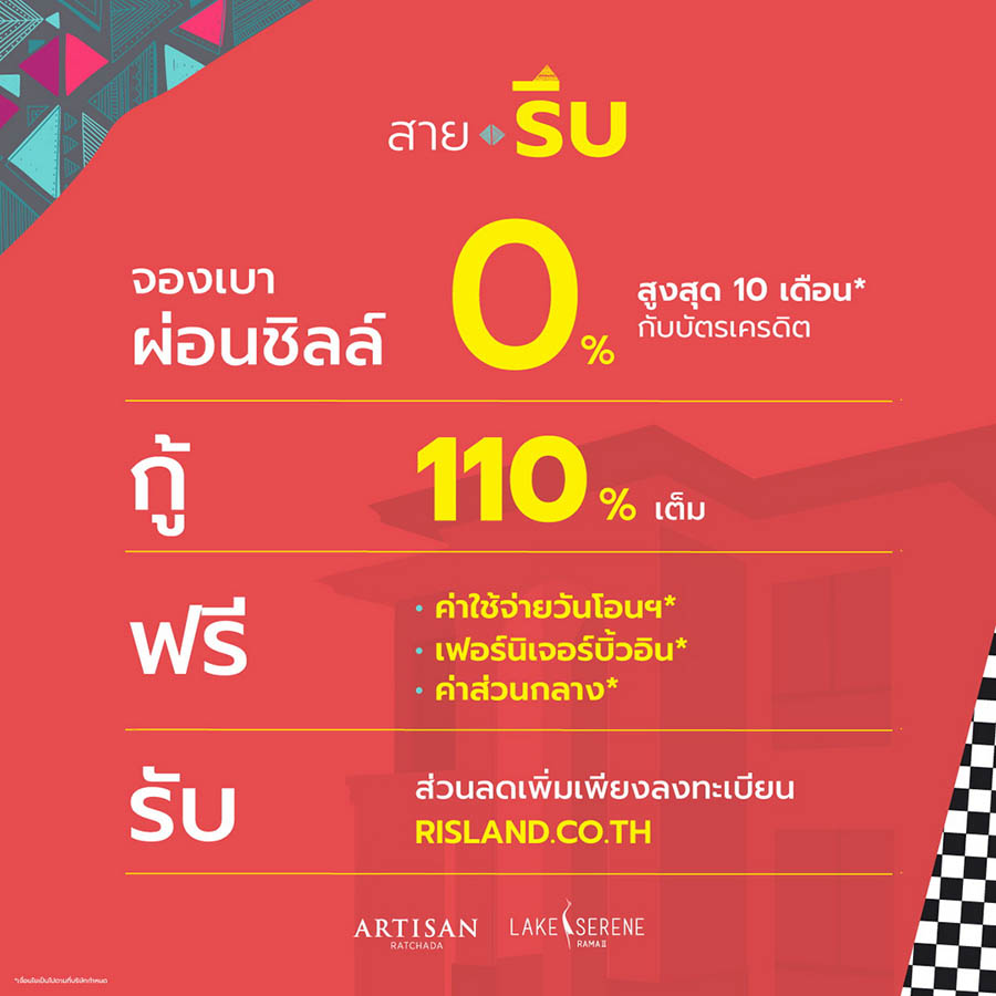 สำหรับคน “สายรีบ” ที่ Ready to move in ก็สามารถจอง 2 โครงการพร้อมอยู่ คือ อาร์ติซาน รัชดาฯ และเลคซีรีน พระราม 2 ซึ่งจองเพียง 5,000 บาท และกู้ได้เต็ม 110% ตามมาตรการ LTV รวมถึงผ่อน 0% สูงสุด 10 เดือนกับบัตรเครดิต พร้อมรับสิทธิพิเศษที่จัดมาให้แบบจุใจ ฟรี! เฟอร์นิเจอร์บิวท์อิน, เครื่องใช้ไฟฟ้า, ค่าส่วนกลาง, เงินกองทุน และค่าใช้จ่ายวันโอน (เงื่อนไขและของแถมเป็นไปตามที่บริษัทกำหนด)