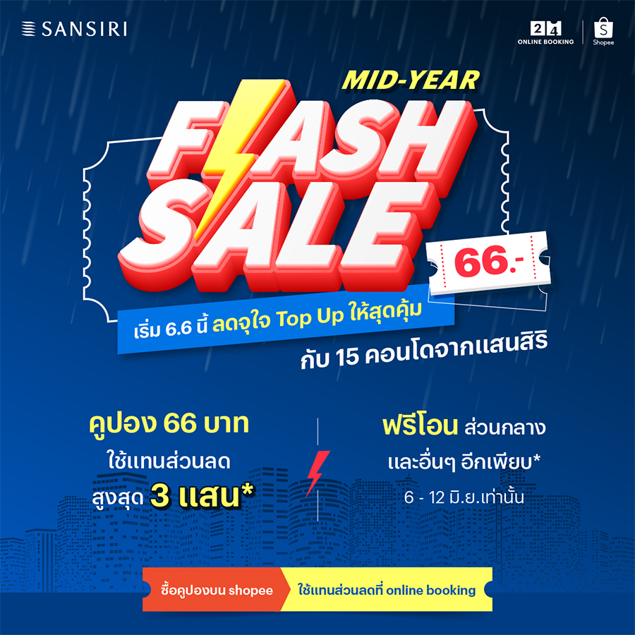 แสนสิริ จัดโปรโมชั่น "Mid-Year Flash Sale!" ลดจุใจ Top Up ให้สุดคุ้ม ครั้งใหญ่ กับ 15 คอนโดมิเนียมจากแสนสิริ เพียงซื้อคูปอง 66 บาท ผ่าน Shopee Sansiriplc http://siri.ly/QBlVwd5 ​แล้วนำมาใช้แทนส่วนลดบน 24 Online Booking ​ลดทันที! คัดยูนิตพิเศษ ทั้งห้อง 1 Bed และ 2 Bed จำนวนจำกัด! เริ่มเพียง 1.39 ล้าน* ​วันที่ 6-12 มิถุนายน 2565 นี้ คุ้มสุดๆ แค่ 7 วันเท่านั้น!​