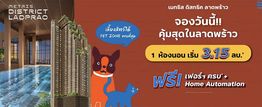 เมทริส ดิสทริค ลาดพร้าว Metris District Ladprao คอนโดใหม่ 230 ม. จาก MRT พหลฯ ติดถนนใหญ่ ไม่ต้องเข้าซอย จองวันนี้คุ้มสุดในลาดพร้าว 1 ห้องนอนเริ่ม 3.15 ล้านบาท ฟรี เฟอร์นิเจอร์ครบ* ฟรี Home Automation