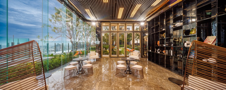 นอกจากนี้ พื้นที่ส่วนกลางชั้น 40 สูงที่สุดในย่าน ให้ผู้อยู่อาศัยได้แวดล้อมไปด้วยธรรมชาติที่ทำให้รู้สึกสงบและผ่อนคลายได้อย่างต่อเนื่องกับ “Panoramic Sky Lounge” สเปซกล่องแก้วใสขนาดใหญ่ ที่รองรับฟังก์ชัน Co-Working & Co-Living เชื่อมต่อทุกมิติของไลฟ์สไตล์คนเมืองยุคใหม่ได้อย่างไม่มีสะดุด ทำให้ชีวิตประจำวันกับการทำงานผสานกันอย่างลงตัว โดยได้รับแรงบันดาลใจจาก The Café by Aman ร้านอาหารที่ซ่อนตัวอยู่ในพื้นที่สวนสีเขียวใจกลางย่านธุรกิจของกรุงโตเกียว และ “Panoramic Sunken Lounge” ส่งมอบการผ่อนคลายพร้อมวิวมุมสูง แรงบันดาลใจจาก Pamukkale ประเทศตุรกี เปิดรับวิวและมุมมองที่สูงสุดในย่าน มิติใหม่ของการพักผ่อน ให้ผู้อยู่อาศัยได้สัมผัสถึงความสงบ และวิวเมืองได้แบบ 360 องศา