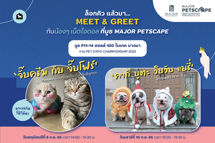 เมเจอร์ ดีเวลลอปเม้นท์ ผู้นำด้านการพัฒนาธุรกิจอสังหาริมทรัพย์ระดับลักซูรีและโครงการที่อยู่อาศัยที่สามารถเลี้ยงสัตว์ได้ (Pet-Friendly Residences) ขนความสนุกสนานและกิจกรรมเพื่อสัตว์เลี้ยงแสนรักที่ Major Petscape Booth ในงาน PET EXPO CHAMPIONSHIP 2022 ภายในงานพบกับ Activity ที่มอบความเพลิดเพลินให้ทั้งเจ้าของและสัตว์เลี้ยง อาทิ MAJOR Signature Photo Booth ร่วมเก็บภาพความประทับใจระหว่างคุณและสัตว์เลี้ยงแบบฟินๆ MAJOR Pet Modeling เปิดโอกาสให้น้องๆ เข้าวงการในอนาคต Quiz Game ร่วมเล่นเกมส์สานรักกับน้องๆ Chilling Music ร่วมฟังดนตรีที่รังสรรค์มาสำหรับน้องหมา น้องแมวโดยเฉพาะ ห้ามพลาด! กับกิจกรรม Meet & Greet ร่วมกรี๊ดให้กับ เน็ตไอดอลน้องหมา น้องแมวชื่อดัง ขวัญใจของชาว Pet Lover