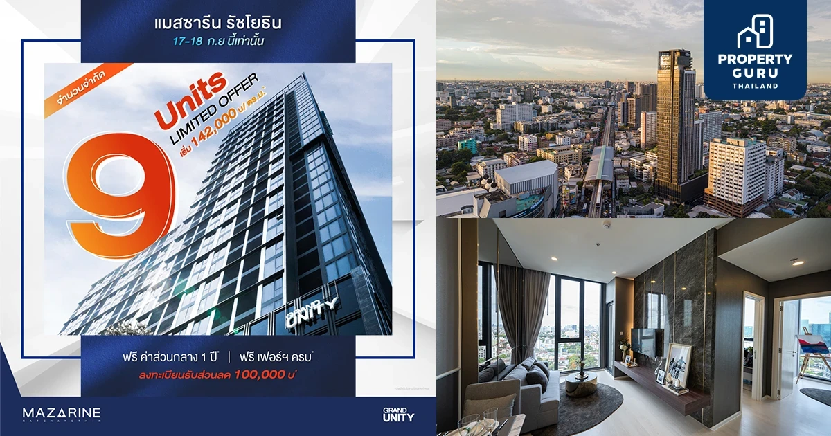 แกรนด์ ยูนิตี้ เตรียมจัดโปรโมชั่น 9 Units LIMITED OFFER รับเดือน 9 พบกับ 9 ยูนิตพิเศษ จากโครงการ “แมสซารีน รัชโยธิน” (MAZARINE Ratchayothin) คอนโดใหม่ พร้อมอยู่ ใจกลางรัชโยธิน ติด BTS รัชโยธิน 0 เมตร พร้อมมอบข้อเสนอสุดพิเศษมากมาย ทั้งส่วนลดพิเศษ* และฟรีค่าใช้จ่ายวันโอน* เฉพาะลูกค้าที่จองในงานวันที่ 17 - 18 กันยายนนี้ เท่านั้น