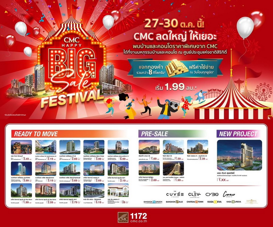 CMC Happy Big Sale Festival : CMC ลดใหญ่ ให้เยอะ พบบ้านและคอนโดใกล้แนวรถไฟฟ้า ราคาพิเศษที่สุดจาก CMC รวม 21 โครงการ งานนี้งานเดียวเท่านั้น!! เริ่มเพียง 1.59 ล้านบาท* แจกทองคำรวมกว่า 8 กิโลกรัม* ฟรีค่าใช้จ่าย ณ วันโอนทุกยูนิต* ลุ้นส่วนลด On Top สูงสุด 50,000 บาท*