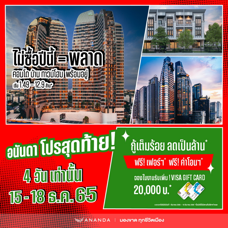 ไม่ซื้อปีนี้ = พลาด! วันที่ 15 - 18 ต.ค. 65 นี้ อนันดา จัดให้คนเมืองที่อยากมีคอนโดและบ้านพร้อมอยู่รับโปรสุดท้าย 4 วันเท่านั้น พร้อมโปรโมชั่นสุดท้ายคุ้มที่สุดของปี