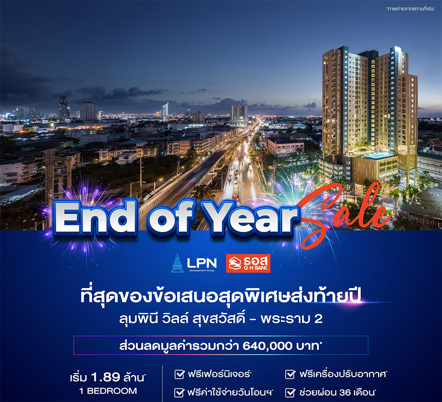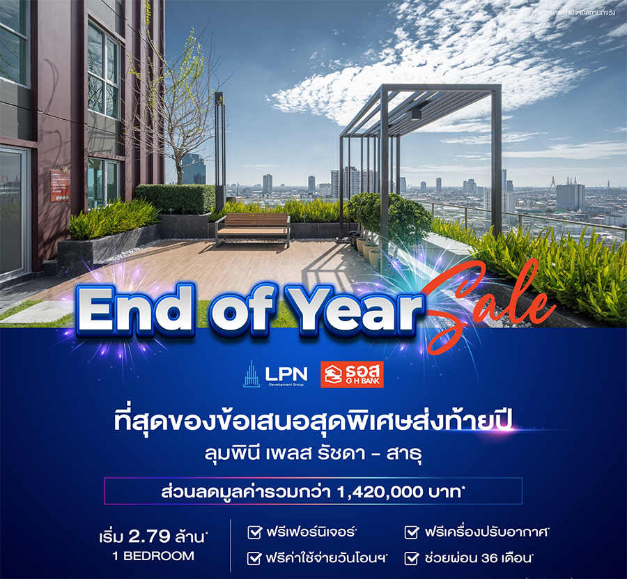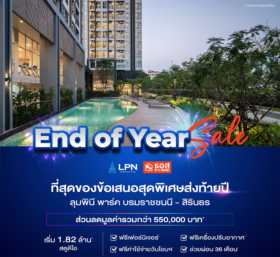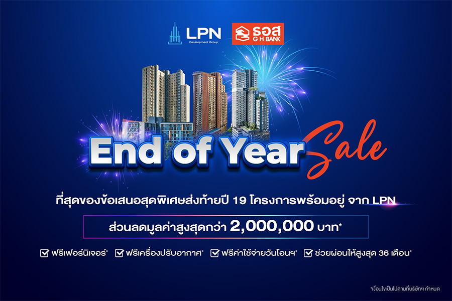 LPN จัดโปรโมชั่น "End of Year Sale" สำหรับโครงการพร้อมอยู่ และโครงการใหม่ 19 โครงการ มอบของแถม และส่วนลดสูงสุด ถึง 2.5 ล้านบาท* พร้อมลุ้น! รับของรางวัลพิเศษด้วยมูลค่ารวมกว่า 700,000 บาท** ข้อเสนอสุดปังด้วยเงินจอง 0 บาท* (เพียงเอกสารครบ) พร้อมรับโปรโมชั่นพิเศษ 5 รายการด้วยกัน ได้แก่ ส่วนลด ผ่อนให้ ฟรีเฟอร์นิเจอร์ ฟรีเครื่องปรับอากาศ และค่าใช้จ่าย ณ วันโอน รวมมูลค่าสูงสุด 2,500,000 บาท*
