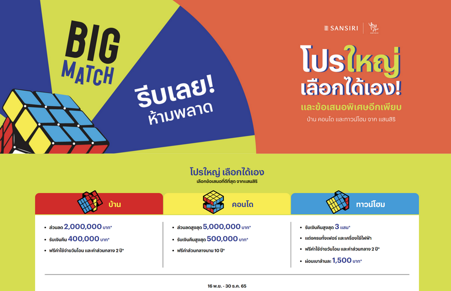 แสนสิริจัดให้เต็มๆ ทิ้งทวนโค้งสุดท้ายกับโปร "บิ๊กแมทช์ BIG MATCH" ให้คุณเลือกโปรที่ชอบกับบ้านที่ใช่ได้เอง ที่บ้าน คอนโดมิเนียม และทาวน์โฮมพร้อมอยู่จากแสนสิริ