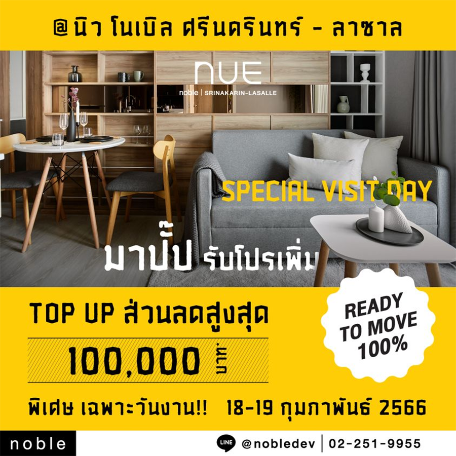 โนเบิล ชวนมางาน “Special Visit Day” ที่โครงการ “นิว โนเบิล ศรีนครินทร์-ลาซาล” คอนโดพร้อมอยู่ ติด MRT ศรีลาซาล เริ่ม 1.69 ล้าน* ส่วนกลางศรีสำราญสุดในย่าน 8 โซน 17 ฟาซิลิตี้