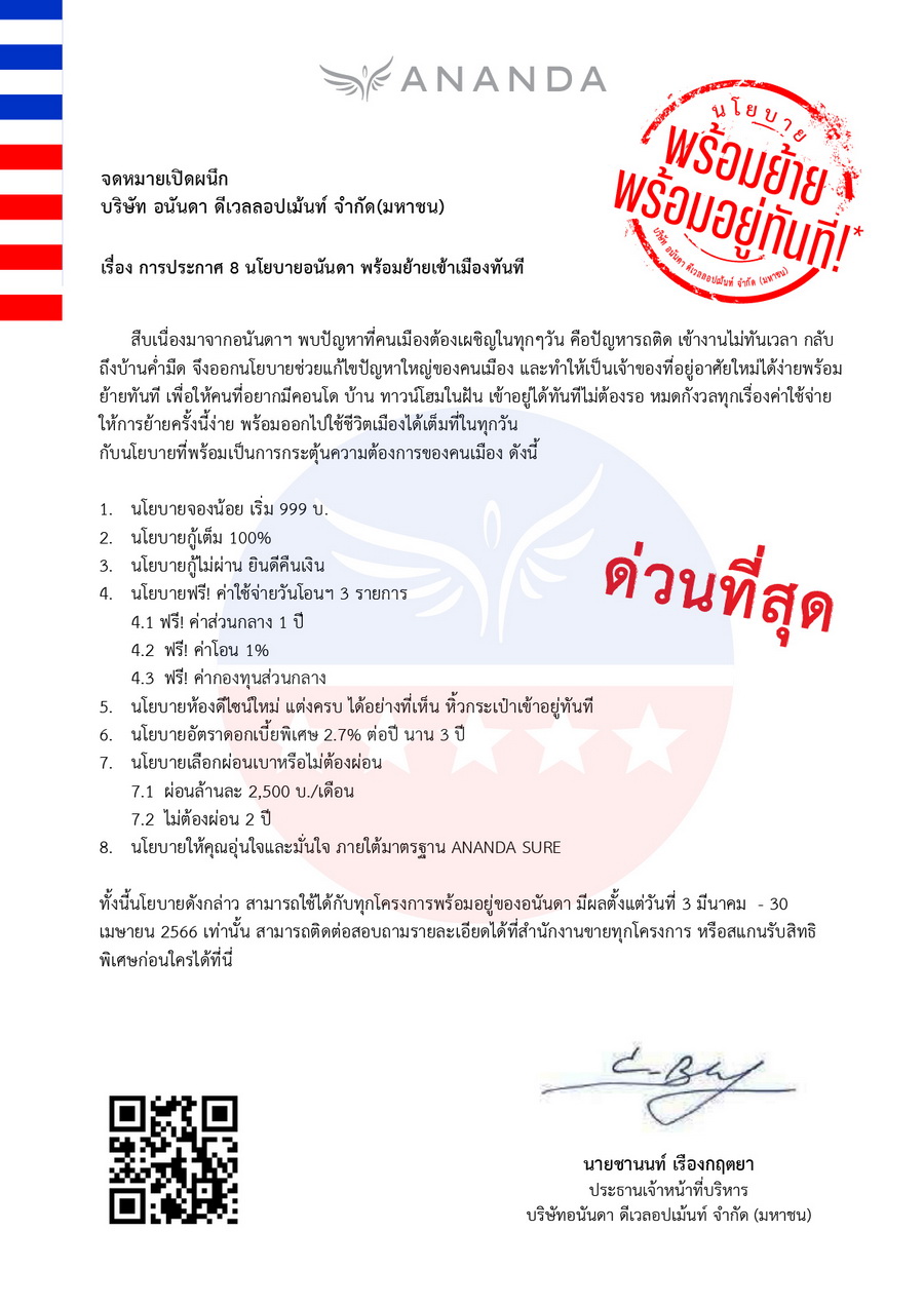 สำหรับ “นโยบายอนันดา 2566” เริ่มแล้วตั้งแต่วันนี้ - 30 เมษายน 2566 โดยลูกค้าที่สนใจสามารถเข้าเยี่ยมชมทุกโครงการของอนันดาฯ