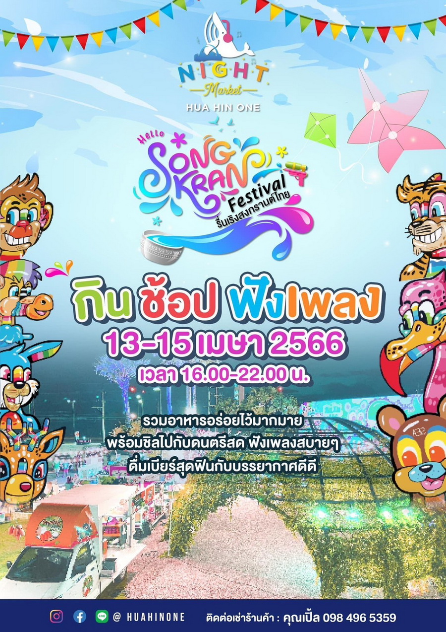 ทิวทะเลเวิลด์ ร่วมกับ ตลาดนัดหัวหินวัน เตรียมจัดงานสืบสานประเพณีสงกรานต์ในธีมงานวัด “Songkran Festival รื่นเริงสงกรานต์ไทย” ระหว่างวันที่ 13 – 15 เมษายน 2566 ตั้งแต่เวลา 16.00 – 22.00 น. ณ หัวหินวัน ภายในงานพบกับร้านค้า ร้านอาหาร ขบวนฟู้ดทรัคมากมาย พร้อมการละเล่นย้อนยุคแนวงานวัด และฟังดนตรีสดเพราะๆ ไปพร้อม ดื่มด่ำกับบรรยากาศสุดฟิน