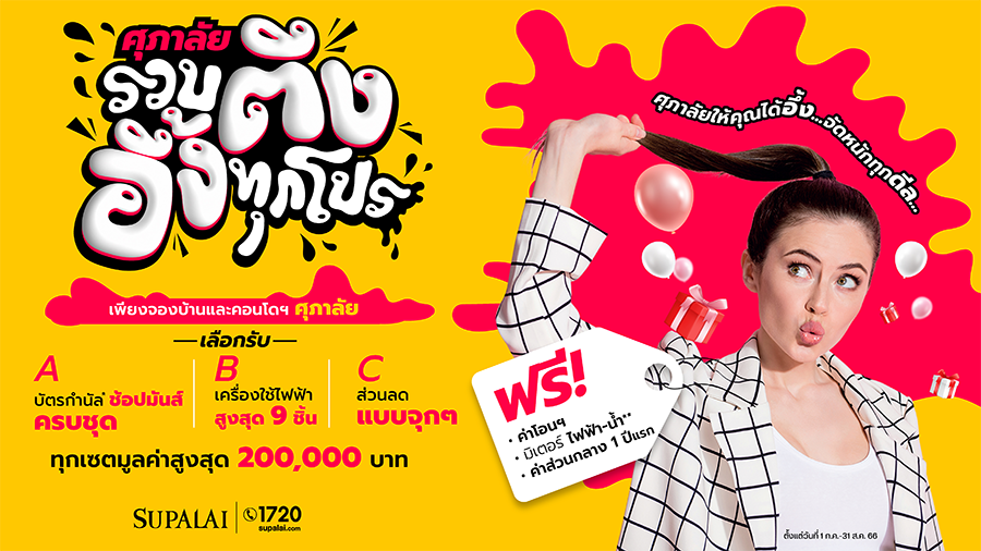 ศุภาลัย พร้อมปล่อยโปรฯ “รวบตึง! อึ้งทุกโปร” รวบทุกข้อเสนอชวนอึ้ง เอาใจคนอยากช้อปบ้านเดี่ยว บ้านแฝด ทาวน์โฮม และคอนโดฯ สร้างเสร็จพร้อมเข้าอยู่ในราคาสุดคุ้ม ไม่จองตอนโปรฯ นี้ จะให้ไปจองตอนโปรฯ ไหน พร้อมอึ้ง...กับโปรรวบตึงทุกของแถม ให้คุณเลือกได้ตามใจ Choice A บัตรกำนัลช้อปมันส์ มูลค่าสูงสุดถึง 200,000 บาท* Choice B เครื่องใช้ไฟฟ้าจาก SAMSUNG สูงสุด 9 ชิ้น* Choice C ส่วนลดสำหรับลูกค้าสูงสุดถึง 200,000 บาท* (*เงื่อนไขเป็นไปตามที่บริษัทฯ กำหนด)