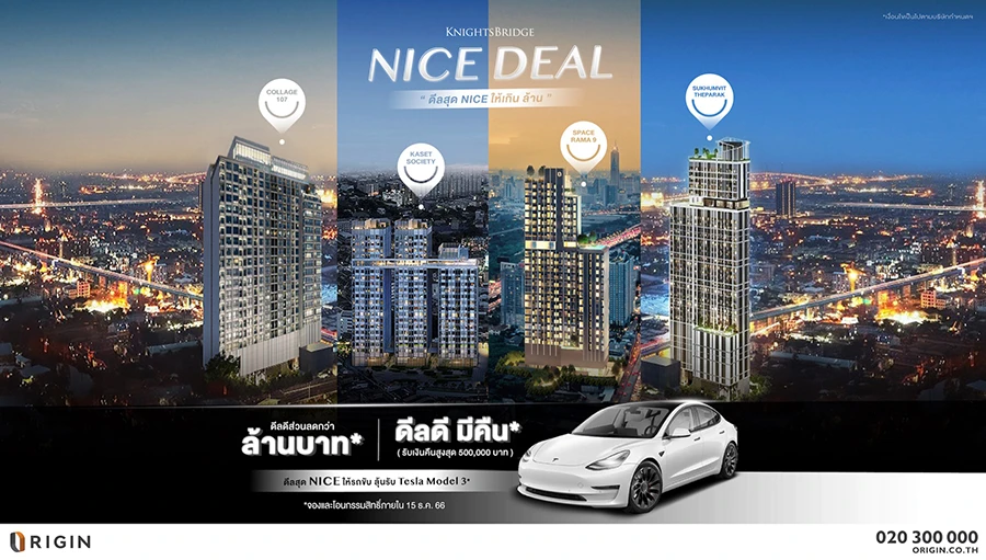 พาร์ค ลักชัวรี่ ผู้พัฒนาอสังหาริมทรัพย์ระดับลักชัวรี่ ในเครือ บริษัท ออริจิ้น พร็อพเพอร์ตี้ จำกัด (มหาชน) จัดแคมเปญ KnightsBridge Nice Deal ดีลสุด Nice ให้เกินล้าน ขนทัพ 4 คอนโดแบรนด์ KnightsBridge (ไนท์บริดจ์) พร้อมอยู่ ติดรถไฟฟ้า ราคาเริ่ม 3.59.ลบ.* เอาใจคนชอบปิดดีล กับโอกาสพิเศษดีลปิดตึก ดีลที่ 1 ดีลดีลดเป็นล้าน* พบกับห้องราคาพิเศษ พร้อมอยู่ ดีลที่ 2 ดีลดีมีคืน (รับเงินคืนสูงสุด 500,000 บาท)* ดีลที่ 3 ดีลสุด Nice ให้รถขับ (ลุ้นรับ Tesla Model 3)* ไขคอนโดสตาร์ท Tesla Model 3 มูลค่ากว่า 1.79 ล้านบาท ปิดดีลภายในวันที่ 15 ธันวาคม 2566 โดยจองได้ตั้งแต่วันนี้เป็นไป *เงื่อนไขเป็นไปตามที่บริษัทกำหนด (สงวนสิทธิ์ลุ้นรางวัลเฉพาะลูกค้าที่จองและโอนกรรมสิทธิ์)