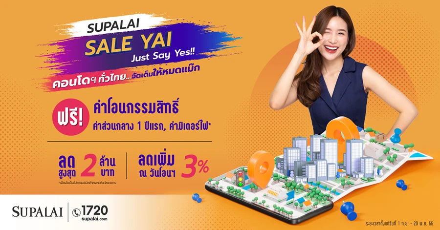 บริษัท ศุภาลัย จำกัด (มหาชน) โดย นางสาวบุศรินทร์ รุ่งรัตนกุล ผู้อำนวยการฝ่ายการตลาดและการขายอาคารสูง กล่าวว่า ตลาดอสังหาฯ คอนโดมิเนียมในช่วงนี้เริ่มมีสัญญาณบวกจากความเชื่อมั่นของลูกค้าที่มีทิศทางที่ดีขึ้น และเพื่อเป็นการส่งเสริมการขายกระตุ้นกำลังซื้อครึ่งปีหลังได้เป็นอย่างดี พร้อมหนุนผู้มองหาคอนโดมิเนียมพร้อมอยู่ที่มีคุณภาพในราคาและเงื่อนไขที่จับต้องได้ บริษัทฯ ได้ออกแคมเปญครั้งใหญ่จัดให้สุดคุ้ม “SUPALAI SALE YAI…Just Say Yes!!” คัดสรรมานำเสนอให้กับลูกค้าได้จับจองเป็นเจ้าของ จัดเต็มแม๊กด้วยดีลโดนๆ พร้อมให้คุณเซเยส พลาดไม่ได้!! ไม่ว่าจะเป็น ส่วนลดเพิ่ม 3% ณ วันโอนฯ* และฟรี! ค่าธรรมเนียมการโอนกรรมสิทธิ์ ค่าส่วนกลาง 1 ปีแรก ค่ามิเตอร์ไฟฟ้า พร้อมทั้งรับส่วนลดพิเศษสูงสุดถึง 2 ล้านบาท* ยกขบวนคอนโดมิเนียมศุภาลัยพร้อมอยู่ พร้อมโอนฯ ราคาเริ่ม 1.29 - 27 ล้านบาท พร้อมปิดทุกดีล!! ตั้งแต่วันที่ 1 ก.ย. - 20 พ.ย. 2566 เท่านั้น! (*เงื่อนไขเป็นไปตามที่บริษัทฯ กำหนด)