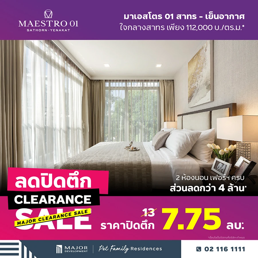 - มาเอสโตร 01 สาทร-เย็นอากาศ คอนโดมิเนียม (MAESTRO 01 Sathorn-Yenakat) คอนโดมิเนียมสไตล์ยุโรปคลาสสิค ติดถนนเย็นอากาศ ใจกลางสาทร นำเสนอห้องชุดพร้อมอยู่ เฟอร์นิเจอร์ครบ 2 ห้องนอน ขนาดพื้นที่ 69.49 ตารางเมตร นำเสนอความพิเศษ ด้วยราคาที่ดีที่สุด 7.75 ล้านบาท เพียง 112,000 บาทต่อตารางเมตร