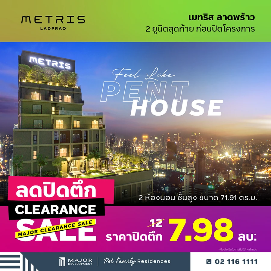 - เมทริส ลาดพร้าว คอนโดมิเนียม (METRIS Ladprao) บนทำเลที่ศักยภาพสูงสุด ใจกลางห้าแยกลาดพร้าว 250 เมตร จากMRT พหลโยธิน โดดเด่นด้วยการออกแบบภายใต้คอนเซปต์ Mid-Century ที่เน้นความคลาสสิกแบบเรียบหรู นำเสนอห้องชุดสุดหรูขนาดใหญ่ พร้อมระเบียงกว้าง ให้ความรู้สึกเหมือนอยู่ PENTHOUSE บนชั้น 27 ขนาดพื้นที่ 71.91 ตารางเมตร ในราคาสุดเอ็กซ์คลูซีฟเพียง 7.98 ล้านบาท