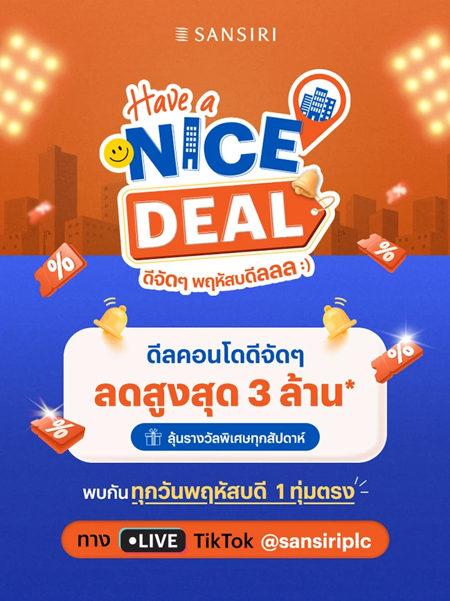 Have a Nice Deal ดีจัดๆ พฤหัสบดีลลล :) รายการไลฟ์สดใหม่แกะกล่อง ร่วมพูดคุยเกี่ยวกับอสังหาริมทรัพย์ในทุกแง่มุม ชวนทำความรู้จักโครงการคอนโดใหม่ ร่วมกับแขกรับเชิญพิเศษในทุกสัปดาห์ อย่างใน EP. ล่าสุด ร่วมพูดคุยเกี่ยวกับเรื่อง เปิดไพ่เช็คดวงปีมังกร! พร้อมเคล็ดลับเสริมรวย มาลุ้นกันว่าราศีไหนมีโชคด้านที่อยู่อาศัย รับทรัพย์เฮงๆ ต้อนรับต้นปีนี้ โดยรายการจะไลฟ์สดทุกวันพฤหัสบดี 1 ทุ่มตรง พร้อมจัดเต็มยูนิตพิเศษและดีลคอนโดดีจัดๆ ลดสูง 3 ล้าน* และผู้รับชมสามารถจองคอนโดคุณภาพจากแสนสิริได้ทั้งโครงการใหม่และโครงการพร้อมอยู่ เช่น เอ็กซ์ที พญาไท , เดอะ ไลน์ ไวบ์, เดอะ เบส เพชรบุรี-ทองหล่อ, เดอะ เบส ไฮท์เชียงใหม่, เดอะ เบส ดาวน์ทาวน์ขอนแก่น, ดีคอนโดรีฟ ภูเก็ต, เดอะ มูฟ บางนา, คอนโดมี บ้านโพธิ์ ฉะเชิงเทรา และอีกหลายๆ โครงการ เป็นต้น ผ่านทาง LIVE TikTok @Sansiriplc ตั้งแต่วันนี้ – 18 เมษายนนี้
