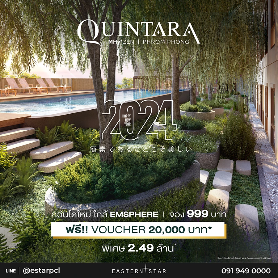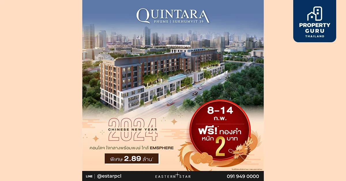 - โครงการ ควินทารา ภูมสุขุมวิท 39 คอนโดห้องพร้อมอยู่ ให้ทุกท่าน "ใช้ชีวิตได้ดั่งใจที่ใจกลางพร้อมพงษ์" ราคาพิเศษล็อตสุดท้ายเริ่มต้น 2.89 ล้านบาท แถมจองวันนี้ – 29 ก.พ. 67 แจกทันทีทองคำหนัก 2 บาท*
