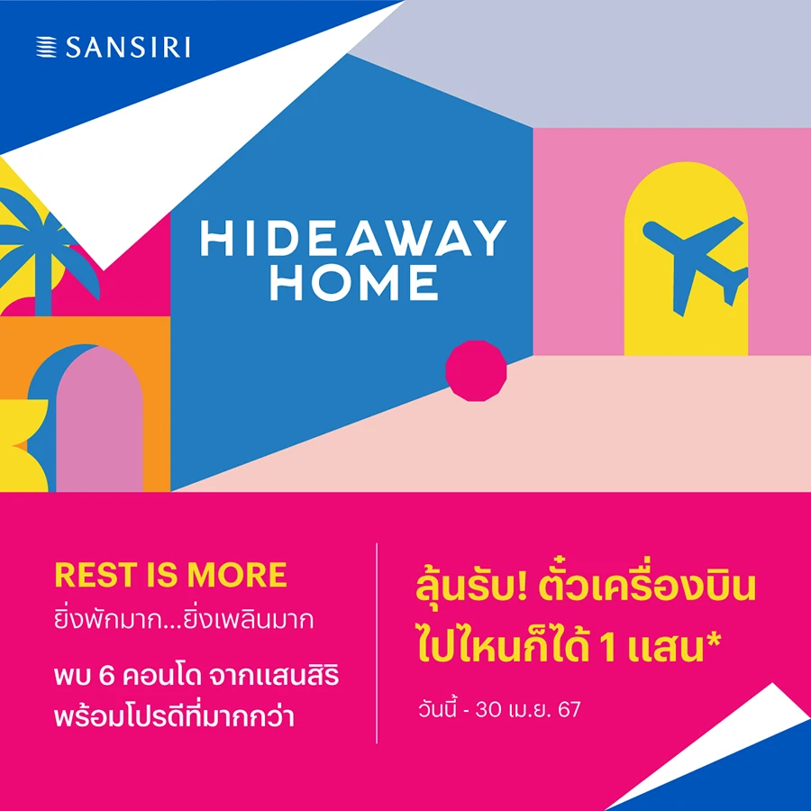 #HideawayHome ซัมเมอร์นี้ จะขึ้นเหนือ ล่องใต้ ไปทะเล ก็ได้เฮทุกโครงการ กับโปรดีประจำซีซั่น พร้อมลุ้นรับ ตั๋วเครื่องบิน บินไปไหนก็ได้ มูลค่า 1 แสน* ที่ 6 คอนโดมิเนียม จากแสนสิริ