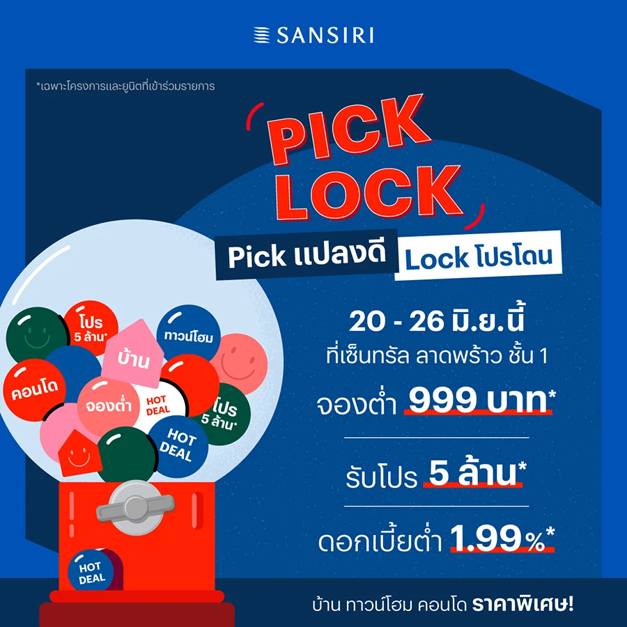 แสนสิริ เสริมทัพมาตรการกระตุ้นเศรษฐกิจผ่านภาคอสังหาริมทรัพย์ กระตุ้นกำลังซื้อ Real Demand จัดอีเวนต์ใหญ่ "PICK LOCK" Pick แปลงดี Lock โปรโดน พิถีพิถึนคัดสรรยูนิตฮอต ทำเลฮิตของการอยู่อาศัย ทั้งบ้าน คอนโดมิเนียม ทาวน์โฮม รวม 36 โครงการ พร้อมรับส่วนลดสูงสุด 5 ล้านบาท* วันที่ 20-26 มิถุนายนนี้ เท่านั้น ที่เซ็นทรัล ลาดพร้าว ชั้น 1 ด้วยข้อเสนอพิเศษเพื่อกระตุ้นการตัดสินใจซื้อ ตอกย้ำผู้นำแบรนด์อันดับหนึ่งของคนอยากมีบ้าน พร้อมมุ่งมั่นพัฒนาที่อยู่อาศัยและบริการให้ตอบโจทย์การใช้ชีวิตและเติมเต็มทุกสไตล์